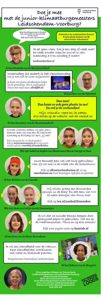 Geïnteresseerd? Stuur een mail naar: info@talentenloods.nl en geef aan van welke school je bent en waarom je graag junior klimaatburgemeester wilt worden.